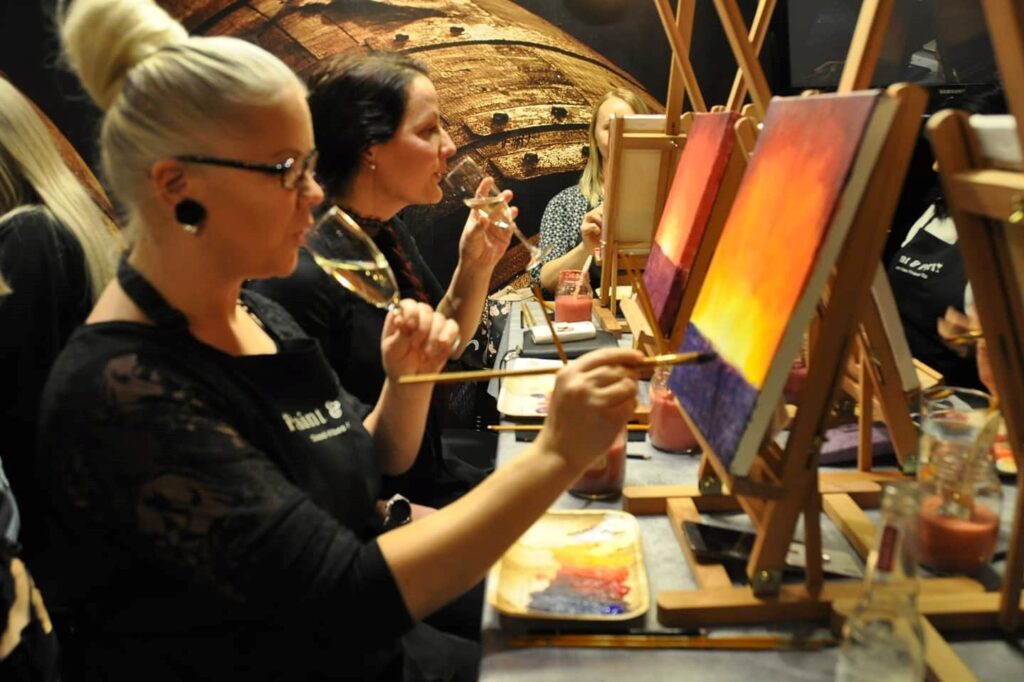 Saapuessasi paikalle löydät sinulle varatun maalauspaikan, tyhjän kanvaasin ja värit siveltimineen. Essu päälle, lasi käteen ja seuraamaan ohjaajan johdolla. Maalaamme yhdessä edeten, mutta sinulla on myös vapaus luoda oman mielesi mukaan – vaihdella värejä ja muotoja tai jopa maalata jotain ihan muuta.