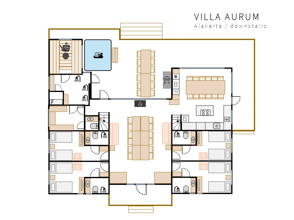 -7 bedrooms, living room, kitchen, 8 WCs, bathroom and sauna facilities