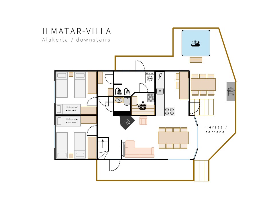 -4 bedrooms, living room, kitchen, 3 WCs, bathroom and sauna facilities